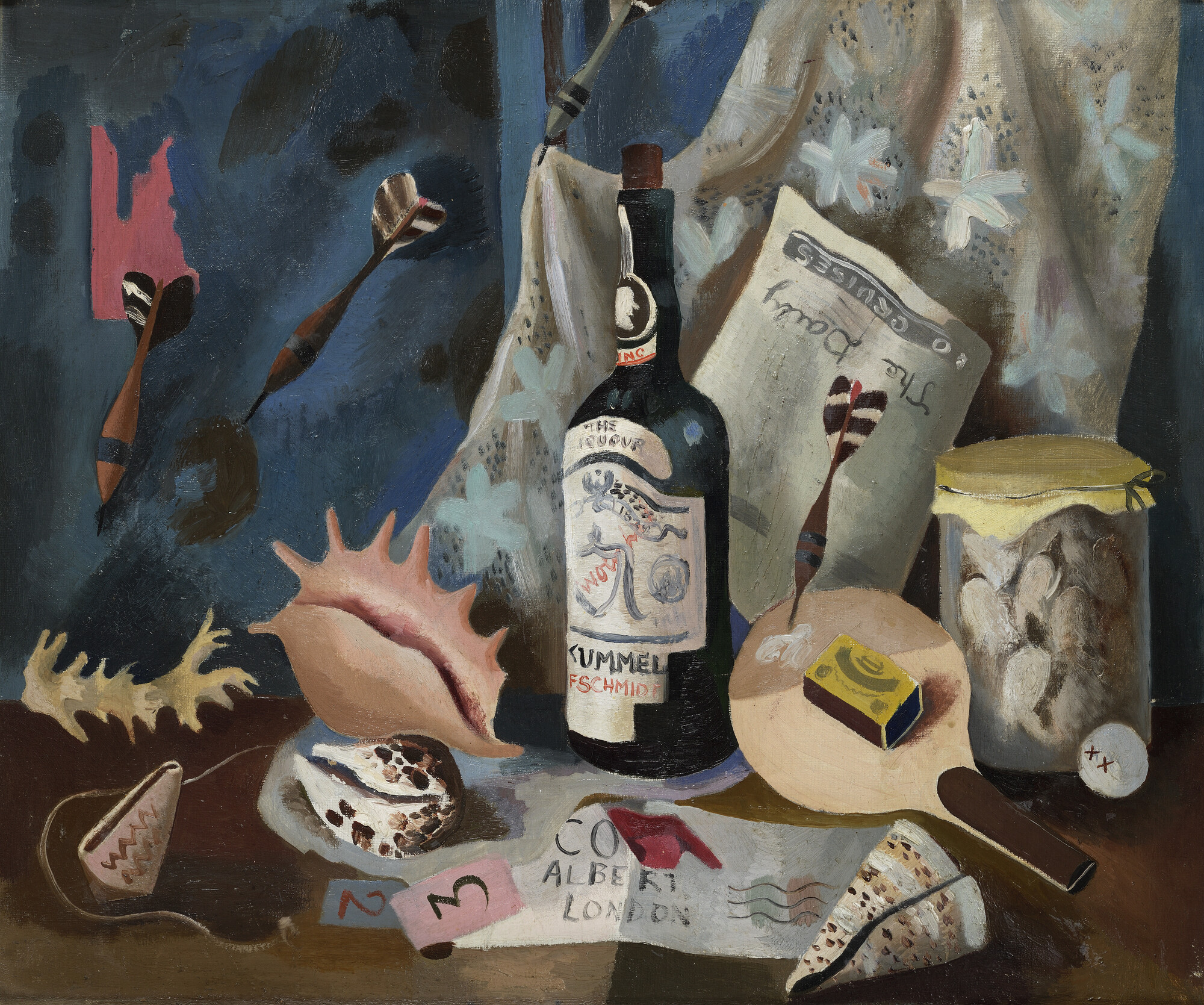 Another Cooper painting that becomes more enigmatic the longer one looks at it is Still Life (1938). The unifying theme is objects that might be encountered on an exotic luxury cruise, including seashells and a bottle of sweet liqueur. There’s also various equipment for onboard games. The table tennis bat and ball lie flat, as they naturally would, but what are we to make of the darts – four, not the standard three – that seem to be dive-bombing the composition? We may speculate about the possible biographical significance: Cooper had recently been on a liner round the Caribbean to help her recover from injuries sustained in a car crash. Her father blamed the driver, her boyfriend, who he thought was an irresponsible speed merchant. As it turned out, parental disapproval didn’t dash the couple’s subsequent long and happy marriage, but the tensions it caused at the time may have influenced and perhaps inspired this painting.
