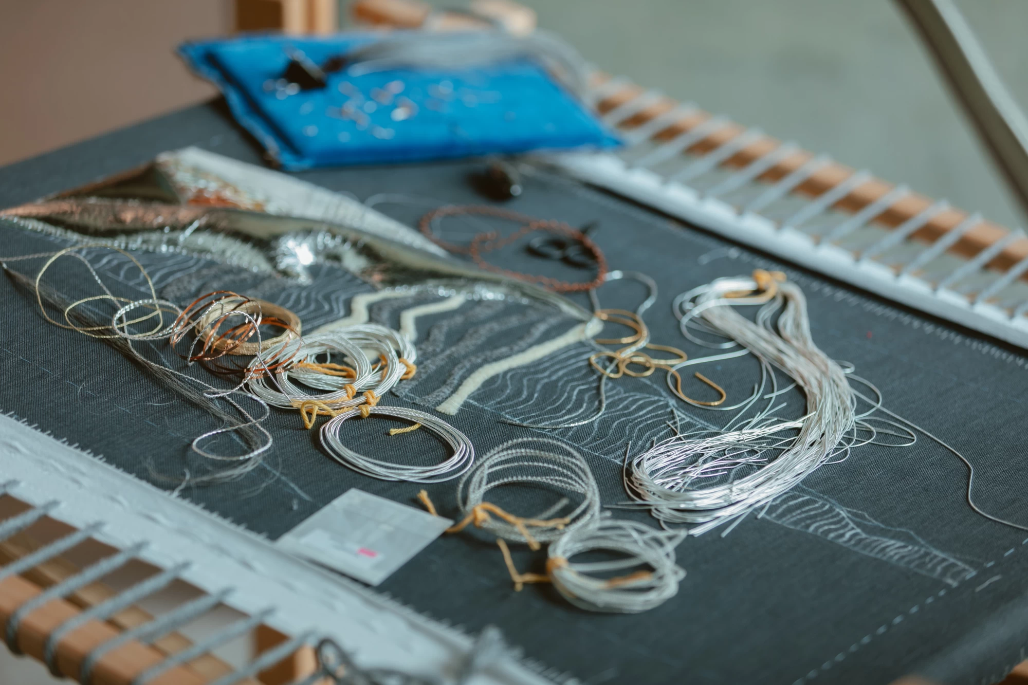 At Towner, Andrea Mindel, a contemporary textile and multi-disciplinary artist based in the UK, carried out their intervention: WAR?! WHAT WAR? - How does one achieve eternal bliss? Using the traditional embroidery technique of goldwork, they sat at traditional embroidery trestles, embroidering a memorial for those affected by the COVID-19 pandemic, using their own hair.